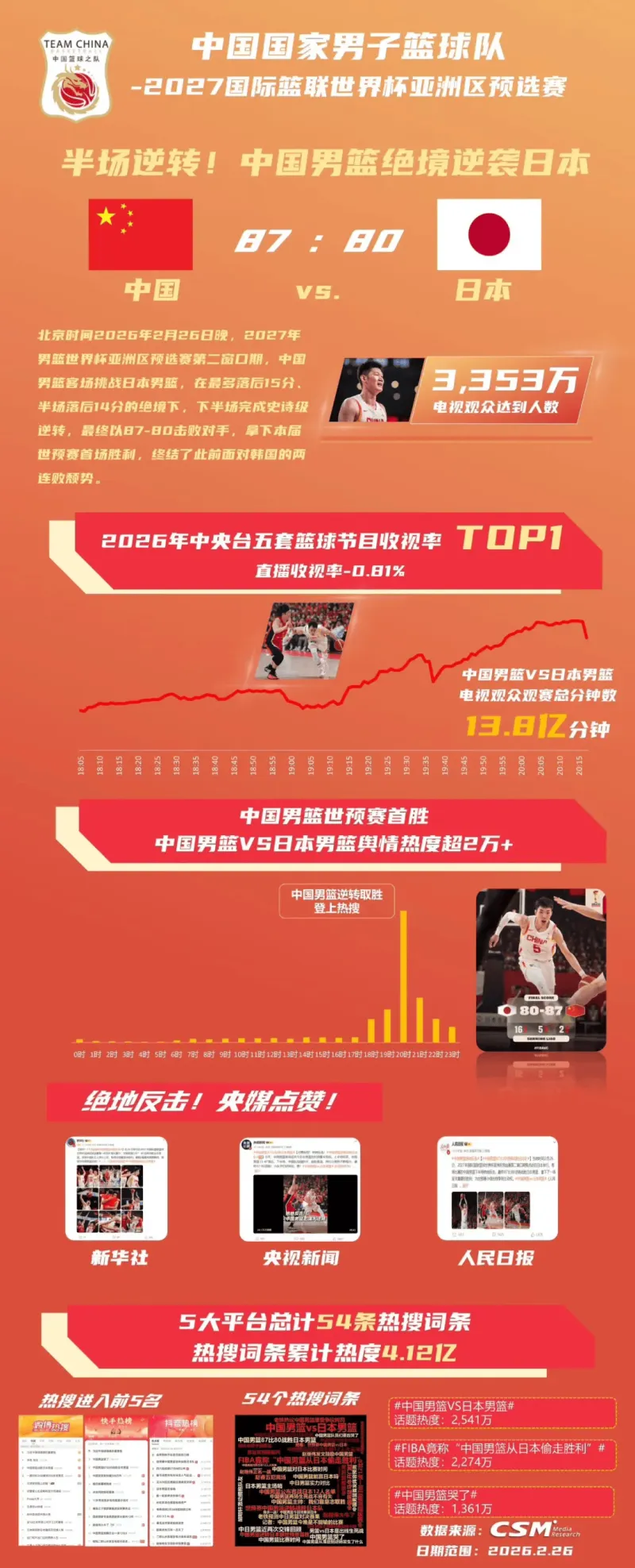 除了官方媒体大篇幅的报道、点赞与点评,我们还看到大家自发发布的社交媒体,剪辑的逆转名场面、球员高光瞬间,这些内容在各大平台的传播广泛。面对日本首战,5大平台产生54条相关热搜,热搜词条累计热度4.12亿;本场比赛的直播收视率0.81%,位列2026年中央台五套篮球节目收视率第一位;比赛电视观众达到人数3353万人,观赛总分钟数13.8亿分钟。