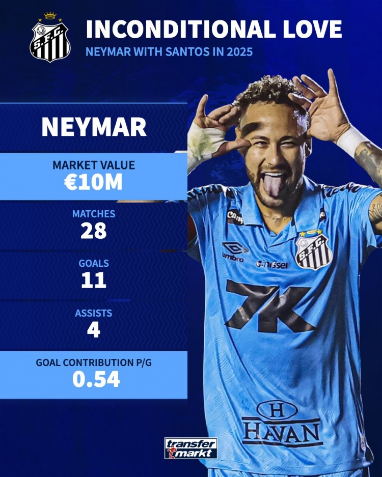 德国转会市场统计了内马尔回归桑托斯以来的数据,他出战28场比赛,打进11球,助攻4次,场均参与0.54球。