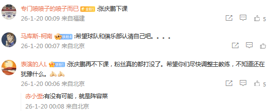 有球迷在官媒点评说道:“张庆鹏再不下课,粉丝真的都打没了。希望你们尽快调整主教练,不知道还在犹豫什么。”